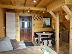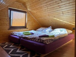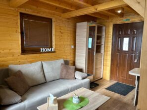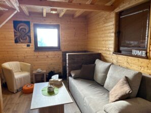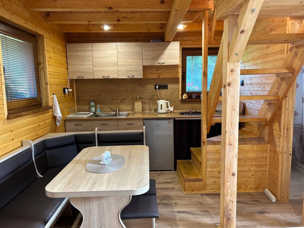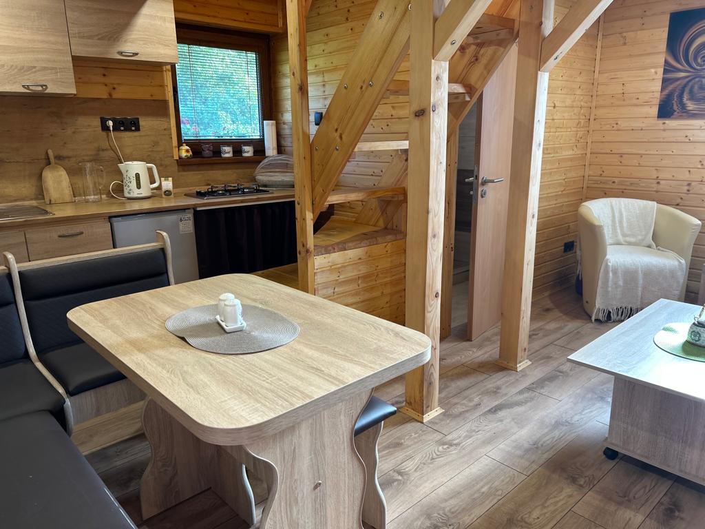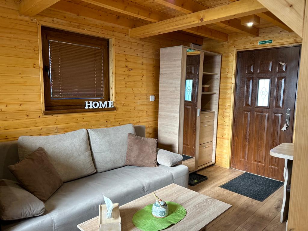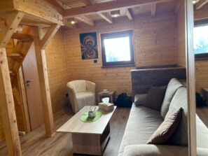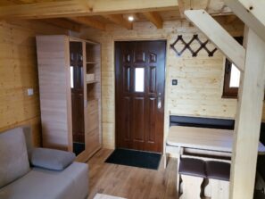 Chatka má vstup do obývačky, ktorá je spoločná s plne vybavenou kuchyňou. Na prízemí sa nachádza kúpeľňa so sprchovacím kútom a WC, na poschodí sú dve malé izby. Pôdorys chatky je 5x5m.